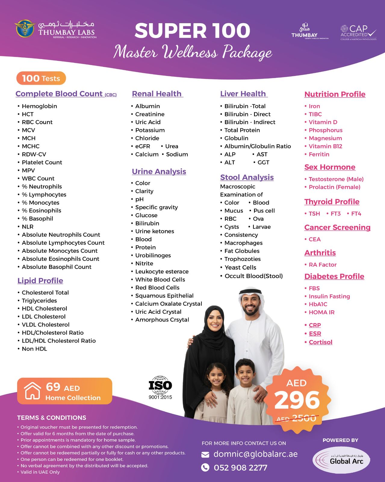 Our inner health plays an important role in helping us to accomplish our daily and long-term goals. Our work-life demands us to be on top of our game, be active to pursue our hobbies and be healthy to spend time with our loved ones. We at GlobalARC value these moments & help you cherish them with great inner Health. SUPER 100 Essential Health Package Thumbay Specially Designed for You. It helps you monitor and maintain your inner health parameters better, so that you are ready to achieve your dreams, always. Being aware is half the battle won – that is exactly what inspired to launch SUPER 4 Essential Health Package from Thumbay Labs to help you understand your health risks, get health recommendations, regular reminders and much more.portant;}”]